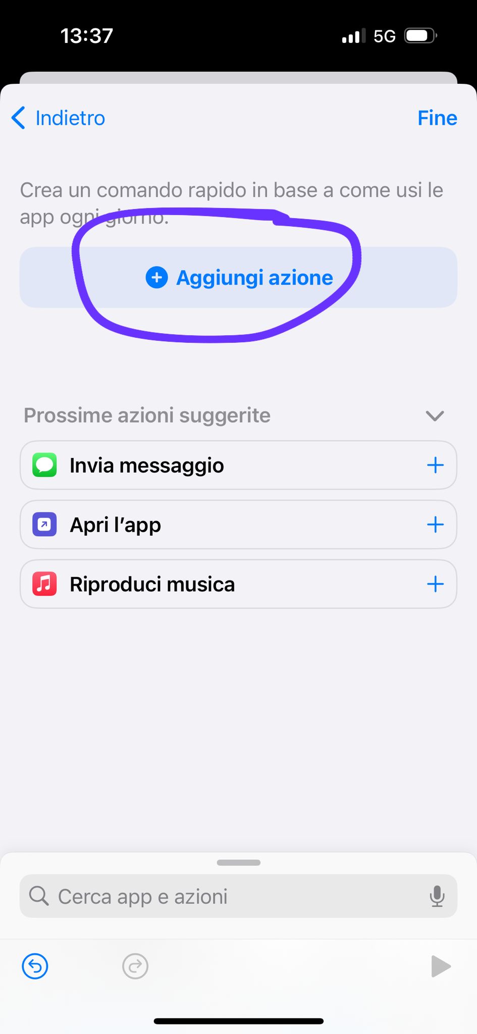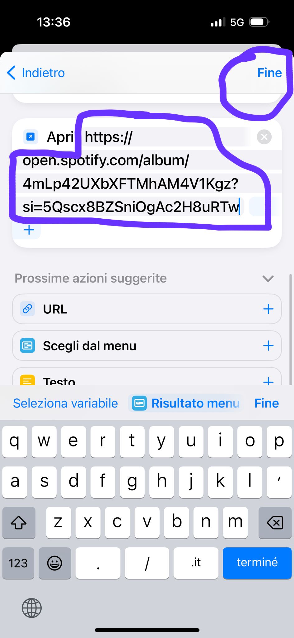 Apri di nuovo l'app ''Comandi Rapidi'' su iPhone e copia il link dell’album Spotify nello spazio affianco a ''Apri''. Clicca su ''Fine'' per completare l’automazione.