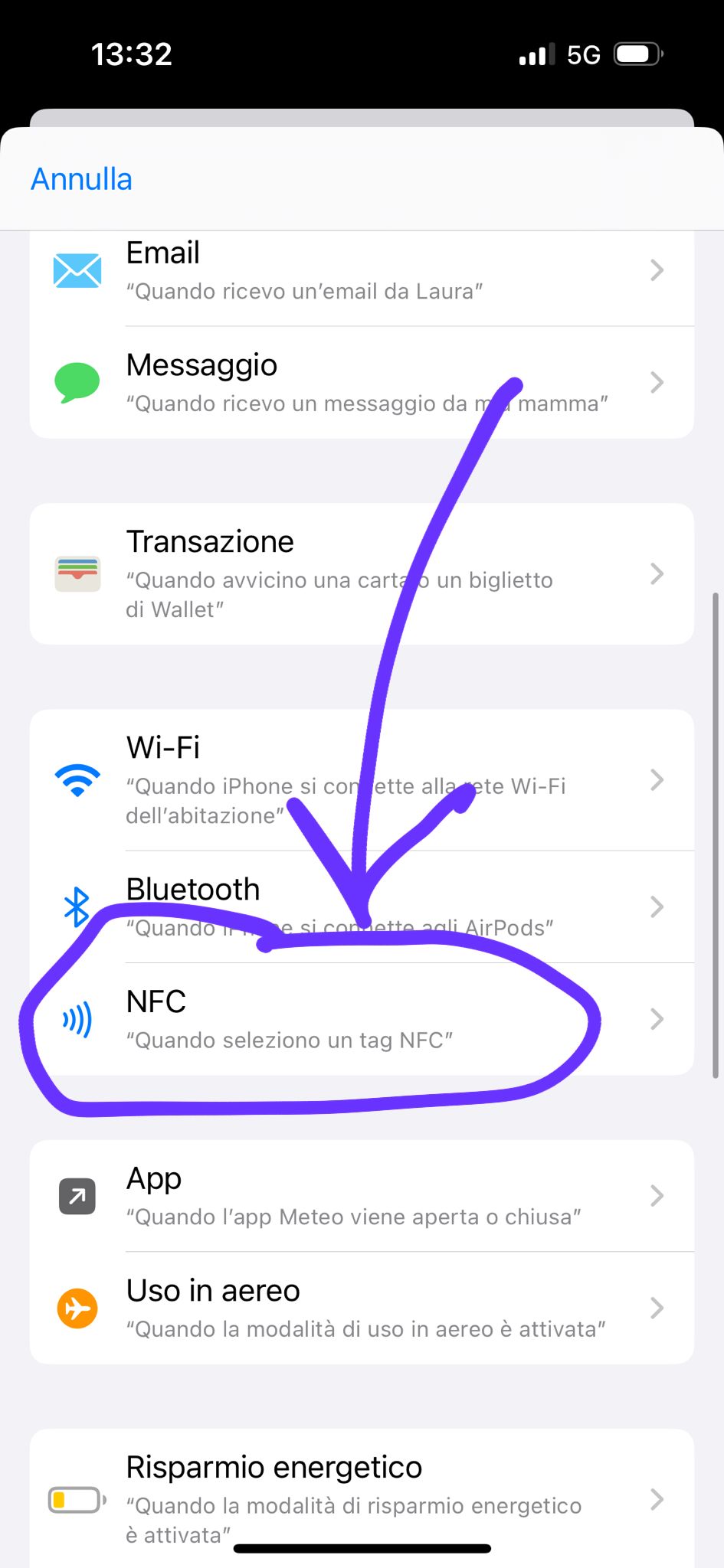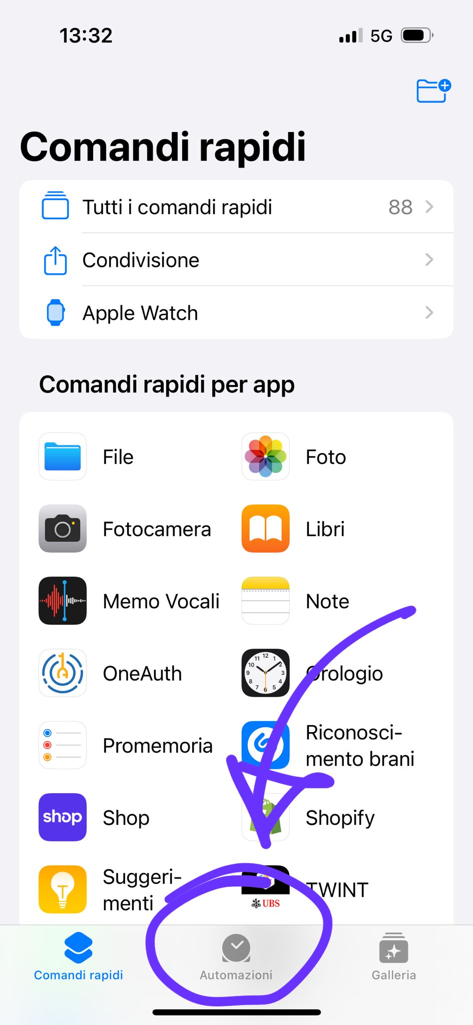 Una volta aperta l’app "Comandi Rapidi", seleziona la scheda "Automazioni" nella parte inferiore dello schermo. Qui puoi creare automazioni personali che si attivano tramite NFC.