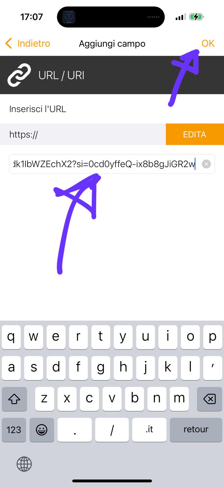 Torna nell'app NFC Tools e incolla il link. Ora clicca “OK” in alto a destra.
