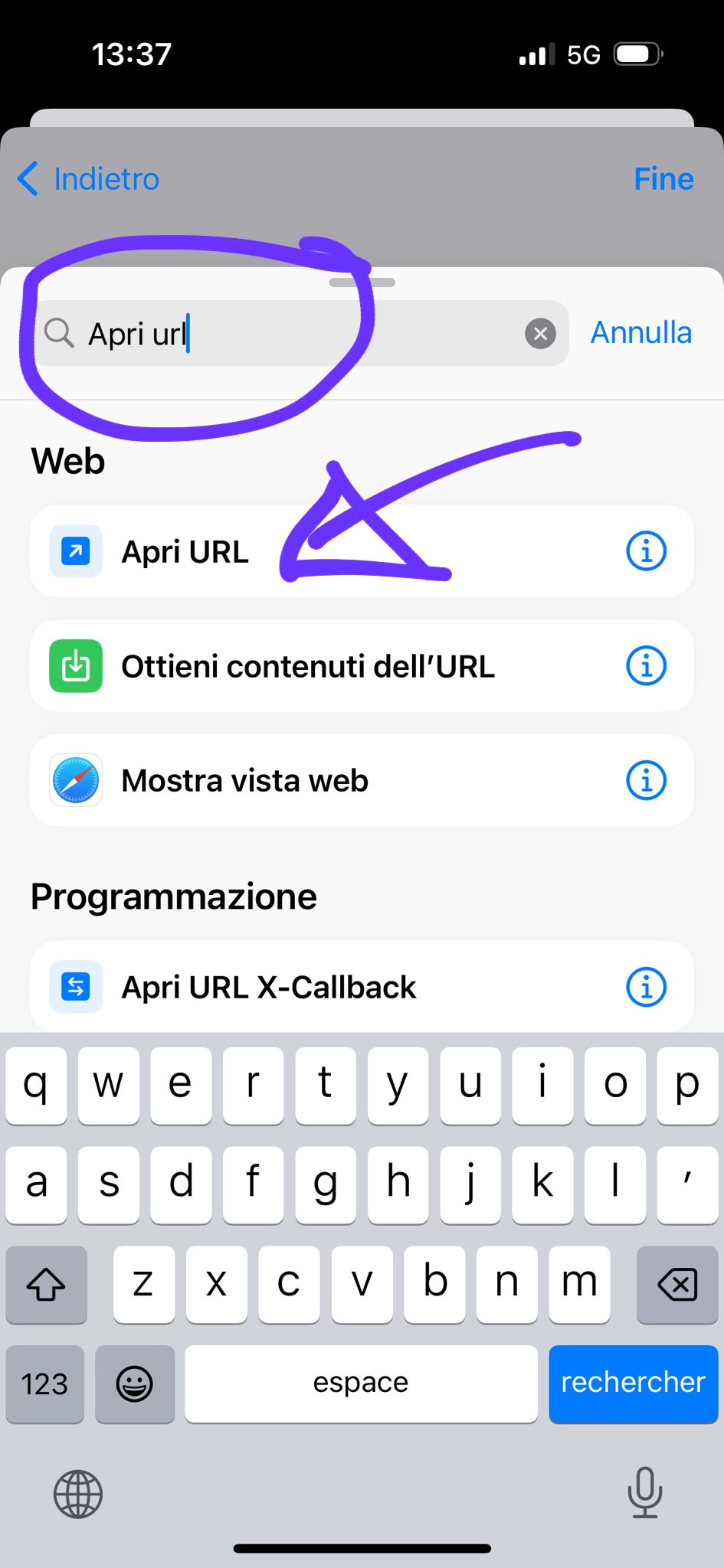 Nella barra di ricerca, cerca e seleziona "Apri URL" per impostare l'apertura automatica di un link.