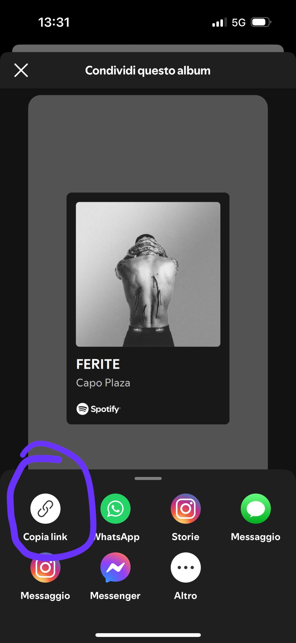 Seleziona "Condividi" nel menu che si apre per ottenere il link dell'album.